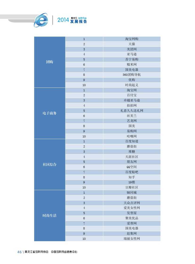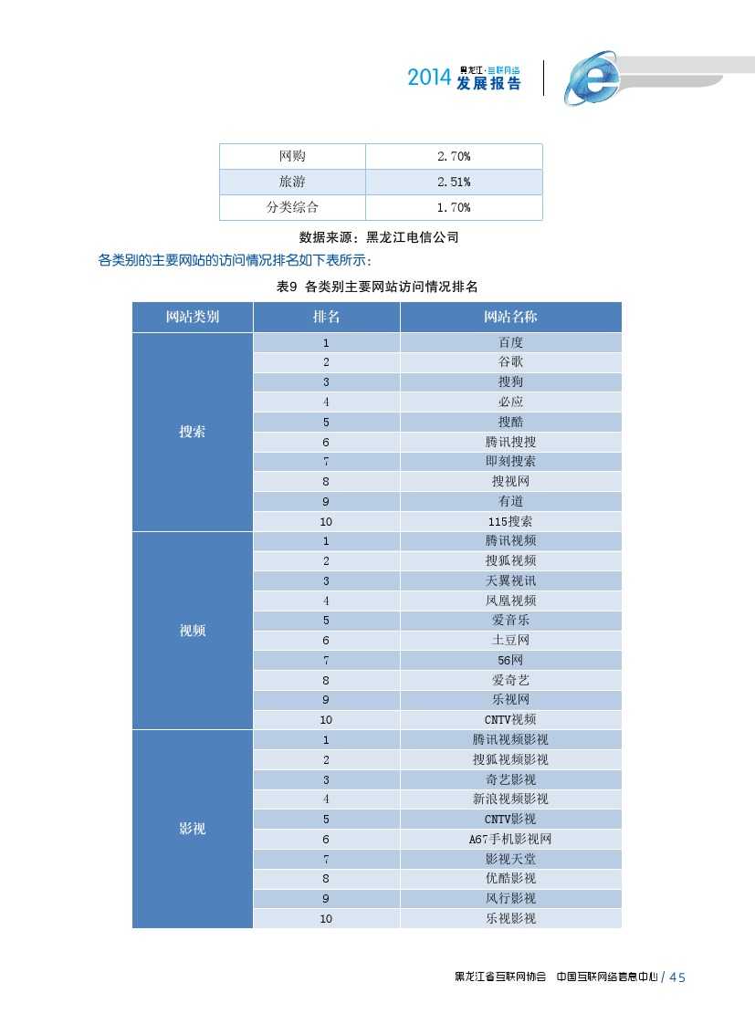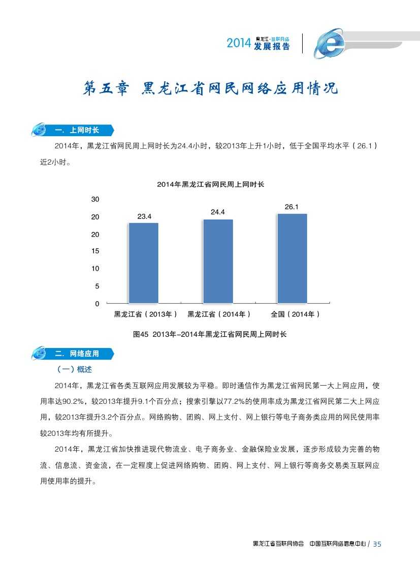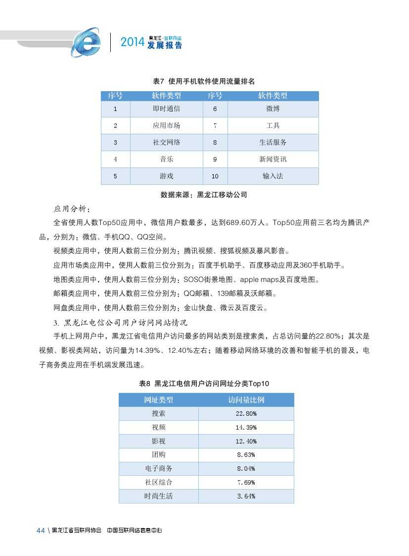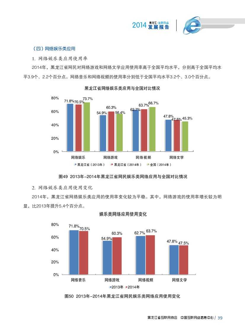 2014年,黑龙江省各类互联网应用发展较为平稳。即时通信作为黑龙江省网民第一大上网应用,使用率由2013年81.1%提升至90.2%;2014年,黑龙江省大力发展现代物流业、电子商务业、金融保险业等新形态服务产业,逐步形成较为完善的物流、信息流、资金流,在一定程度上促进网络购物、团购、网上支付、网上银行等商务交易类互联网应用使用率提升。