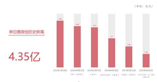 而去年的单日票房纪录是在2014年6月28日,《分手大师》和《变4》上映次日所产生的2.7亿。现在看看,这样的成绩已然很平常了。