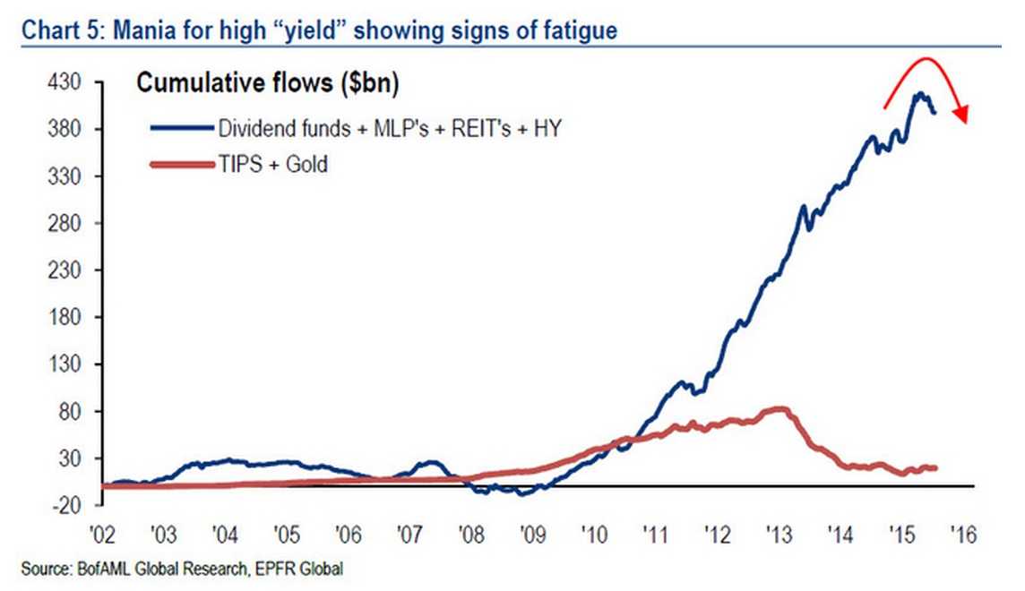 随着美联储加息路径逐渐清晰,超低利率的时代也即将结束,意味着原本市场疯狂“追求收益”的思路将发生改变。而且,当前以MLP、Dividend fund、Reits等为代表的高收益资产已经创下2008年金融危机以来最大幅度资金流出。