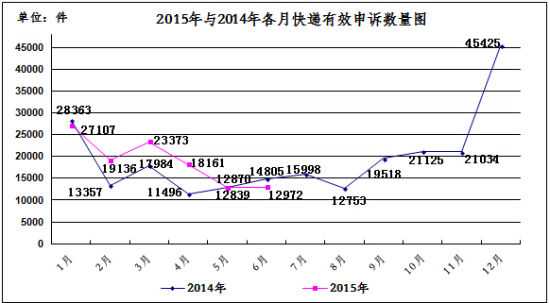 2015年6月,受理消费者关于快递业务的有效申诉12972件,环比增长0.8%,同比下降12.4%。