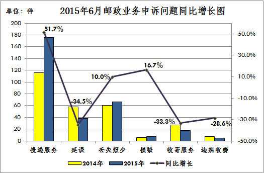 2015年6月,邮政业务的投递服务问题、邮件损毁、邮件丢失短少同比呈增长趋势,分别增长51.7%、16.7和10.0%。