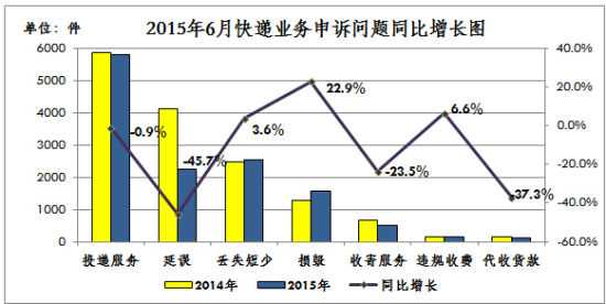 2015年6月,快件延误方面的申诉同比出现较大幅度下降,快件损毁方面的申诉环比、同比增长幅度仍较大。