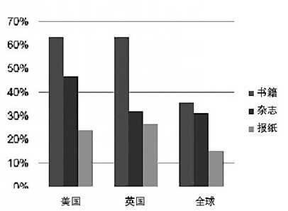 在英国,2015年图书行业总收入中的20%来自数字业务,杂志行业的这一比例为16%、报纸行业为14%。到2020年,数字业务在三大行业中的比例将分别增至63%、32%和26%。在美国,2015年图书行业的数字化比例为41%、杂志为24%、报纸为17%,到2020年三大行业的数字化比例将分别达到63%、47%和24%。