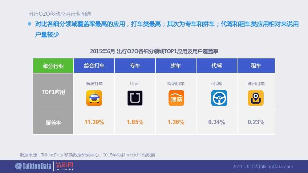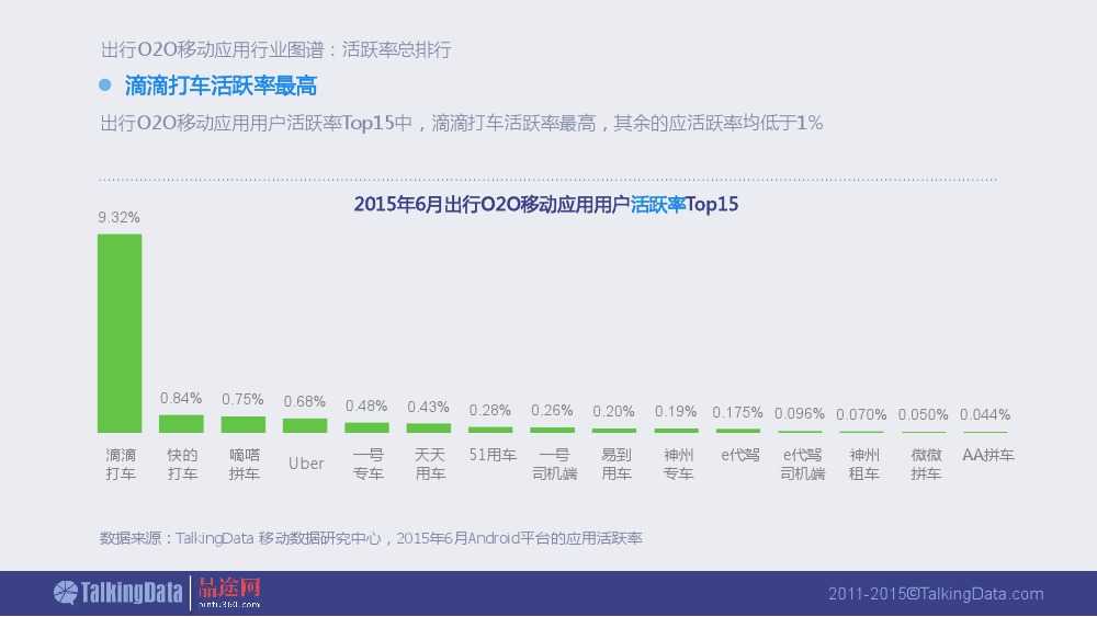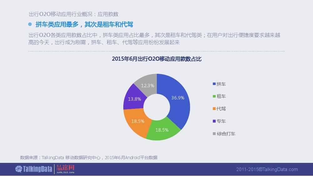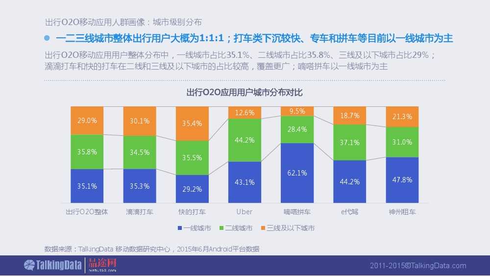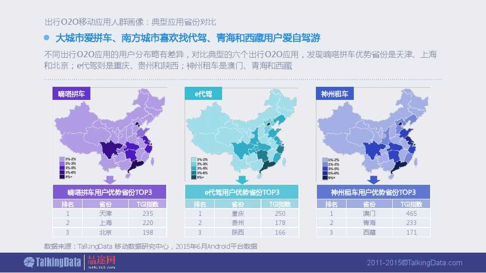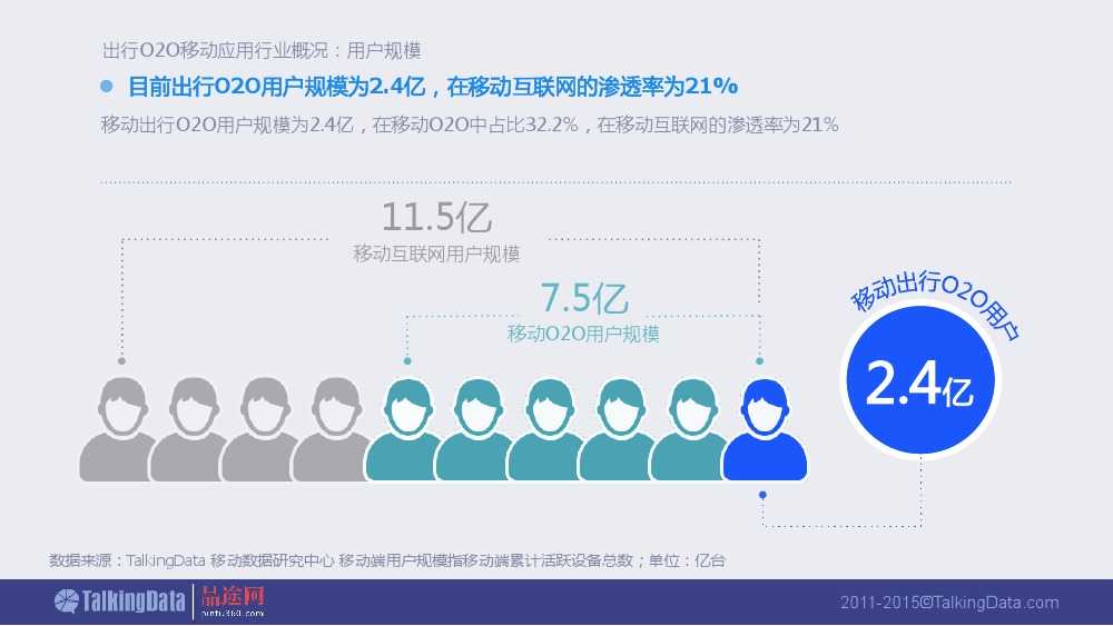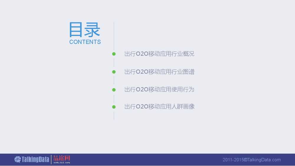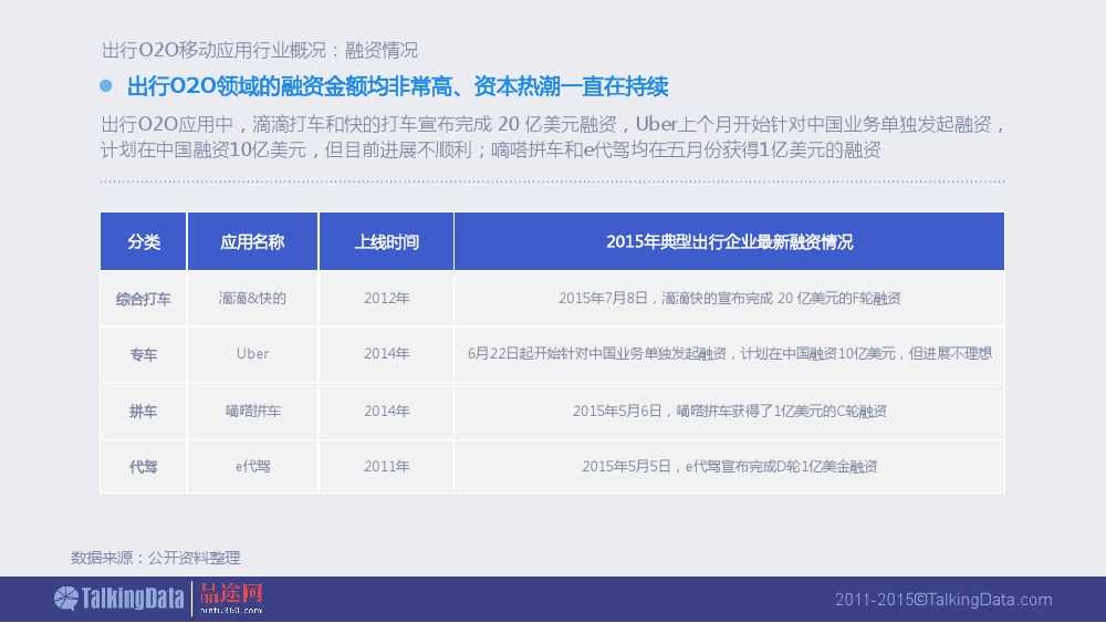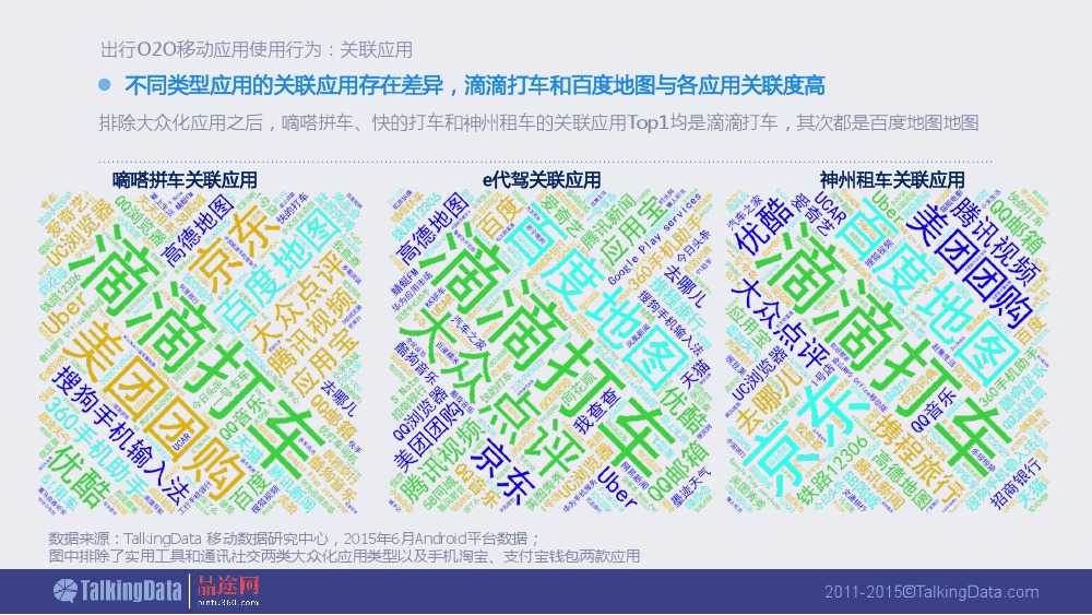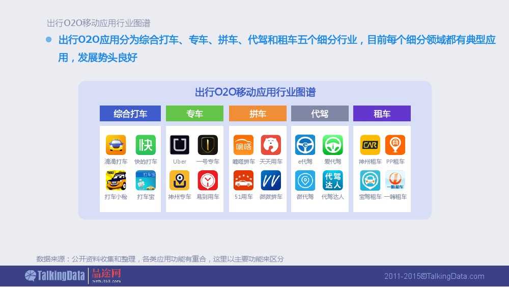 TalkingData:2015年出行O2O移动应用行业报告 更多阅读:TalkingData:2015年上门O2O移动应用行业报告TalkingData:2015年餐饮O2O移动应用行业报告Talkingdata:2015美业O2O移动应用行业报告TalkingData:2015年社区O2O移动应用行业研究2015年生活服务类移动应用白皮书TalkingData:2015年12月 O2O应用潜力榜及年终榜单盘点TalkingData:2015年奔跑吧兄弟2电视直播观看人群用户画像TalkingData:2014年移动电台应用行业报告TalkingData:2014年移动音乐应用行业报告TalkingData:2015年8月移动游戏BenchmarkTalkingData:2015年Q2 Apple Watch数据洞察报告TalkingData:2015上半年移动游戏行业报告友盟+:2016年Q1 O2O移动应用发展报告TalkingData:2014年移动购物助手应用行业报告2015年上半年京东智能硬件行业报告(PPT完整版)