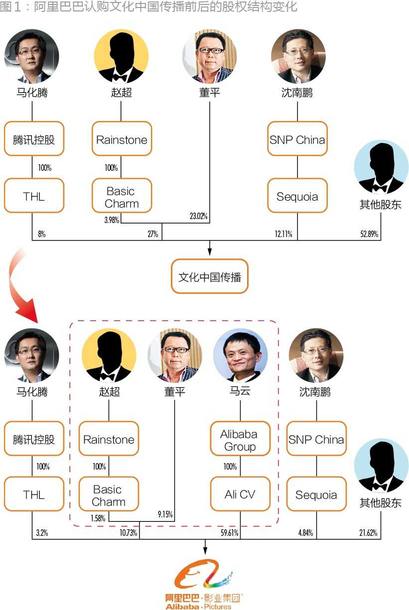 2014年6月25日,文化中国传播公告称,阿里巴巴通过旗下公司Ali CV出资62.44亿港元,以0.5港元/股(较2014年2月24日收市价0.63港元/股折让约20.63%)的价格认购该公司124.88亿股股份,持股比例达59.61%。这标志着阿里巴巴成为该公司控股股东,马云正式杀入影视圈。