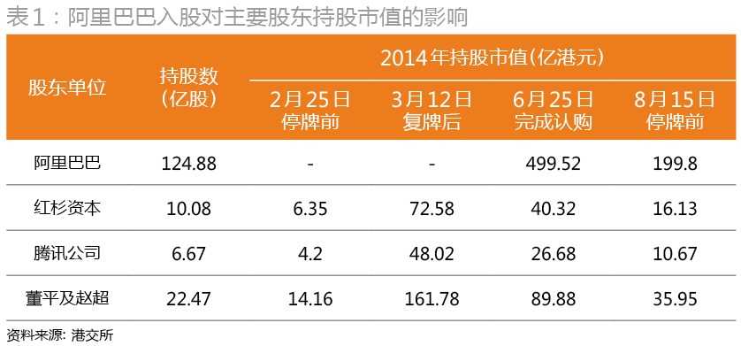 此番股价上涨,不仅使得马云自己持有的股份市值飙升,更乐翻了他的“小伙伴们”(表1)。入主前,知名投资人沈南鹏掌舵的红杉资本(Sequoia Capital)持有阿里影业12.11%股份,位居第二大股东。而马化腾旗下的腾讯公司也是战略投资者,通过子公司持有8%股份。该次认购虽将二者股份摊薄,但其财富跟随马云水涨船高,亦不失为赢家。