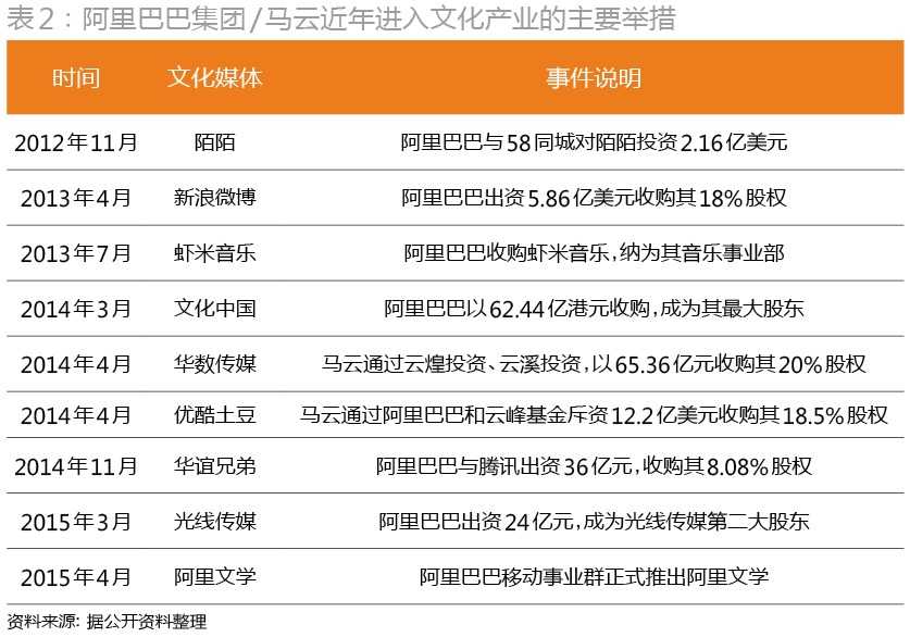 阿里巴巴,这家电商界无人不晓的巨头,在影视圈却是个不折不扣的新手(表2)。虽然马云早年以个人身份投资过华谊兄弟,但阿里影业才是“阿里系”真正发力影视圈、搭建影视平台之起点,入股光线传媒等影视公司均在此之后。早在2013年7月,有消息称,阿里巴巴意图收购PPTV,最终不了了之。2013年9月,阿里巴巴在原先25个事业群的基础上增设数字娱乐事业群,由音乐、视频、读书、家庭娱乐、原创组成,原虾米音乐事业部进入该事业群。直至2014年3月,阿里巴巴数字娱乐事业群才推出娱乐宝平台,与影视相关的淘宝电业务也是2014年才全面投入运营。