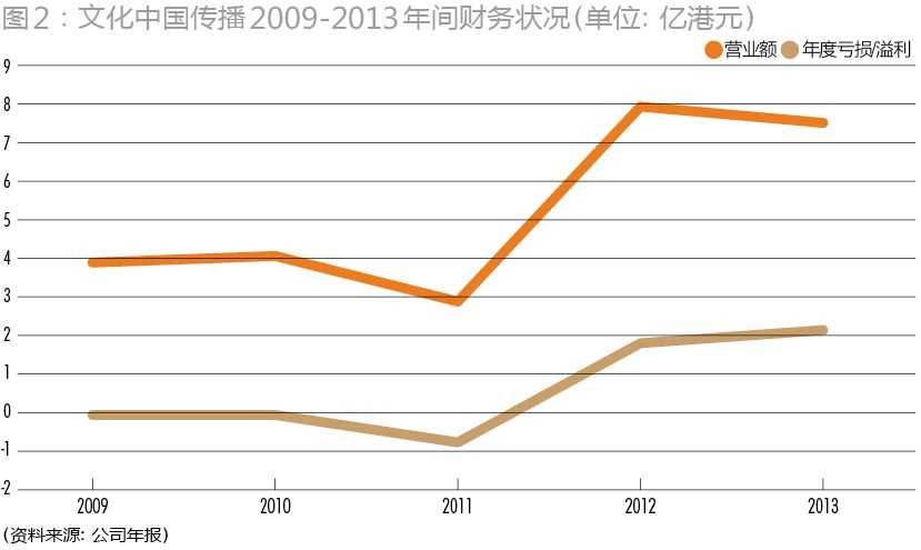 在此期间,相比快速发展的移动媒体业务,文化中国传播的影视剧业务发展近乎停滞。2013年,其影视剧业务营收4.2亿港元,利润1.71亿港元;而2012年其影视剧业务实现4.16亿港元,利润1.62亿港元。从文化中国传播2013年度影视剧、媒体广告和移动娱乐三大业务结构看,影视剧业务仅占56.1%,媒体广告等非影视剧业务占总收入比例近一半。