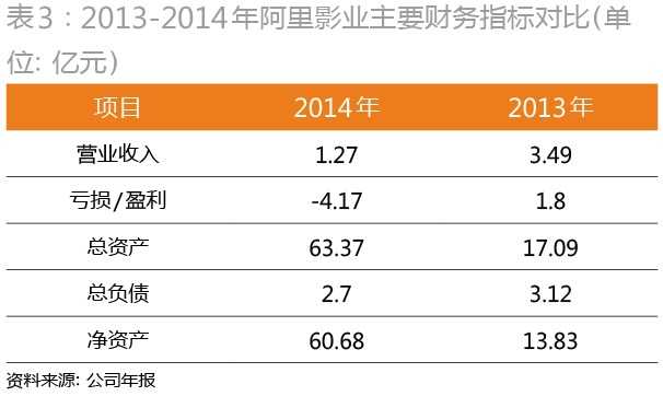 经营一周年的影视业务不进反退,成为阿里影业的亏损重头。其年报显示,来自持续经营业务的亏损为3.82亿元;而已终止经营业务的亏损仅仅363万元。2014年度影视业务营业收入为1.15亿元,而2013年同期为3.27亿元,减少2.12亿元;2014年度的影视业务税前亏损为0.66亿元,而2013年度的税前利润为1.51亿元。
