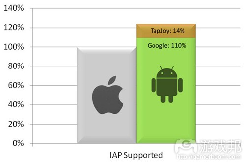 TapJoy让Android和iOS在IAP上的盈利拉开了14%。在Android方面,TapJoy的Marketplace采用奖励安装模式,支持玩家下载应用以获得免费的虚拟货币。为了免费获得这些虚拟货币,玩家乐于下载其他应用并试用,尤其是免费应用。在我看来,这是个三赢战略,玩家免费获得货币,我们获得盈利,第三方应用制造商获得安装量。正是这个因素让Android与iOS的盈利有了显著的差别。