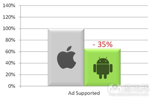 那么,这种传统观念是否正确呢?根据我们Mobile Deluxe的调查结果,似乎并非完全正确。在广告赞助应用(游戏邦注:指应用通过条幅广告和空间来盈利,玩家无需支付金钱)方面,iOS似乎是个较好的平台。但是采用IAP的应用(不含广告,玩家可以付费丰富游戏体验)方面,Android显然是赢家。