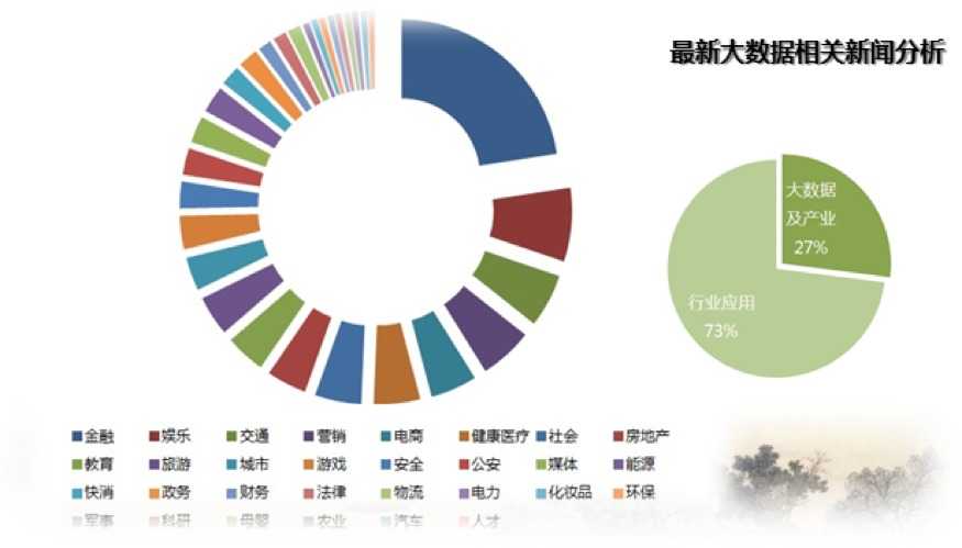 如上图所示,从最近跟大数据相关的几千条新闻中可以看到,今年一个很大的变化是跟大数据的概念、理念、知识背景和大数据本身产业技术相关的新闻大概占到了27%,剩下73%都是各行各业的大数据应用。这些大数据应用涉及到30个行业,其中主要的是金融、娱乐、交通、营销、电商等等,这个数据也说明,未来大数据的发展趋势:一定是跟行业应用相结合,秦雯女士分析。