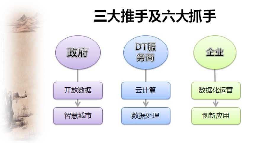 所谓六大抓手就是落到应用上的六个抓手,归纳成三个角色在推动大数据落地,政府、DT服务商(对应原来的IT服务商)、企业。政府的抓手分两个,一个是开放数据,即政府、社会公共数据的开放,第二个是智慧城市的推进。DT服务商的抓手则分为云计算和数据处理的技术和方法。企业的抓手是数据化运营和创新应用。