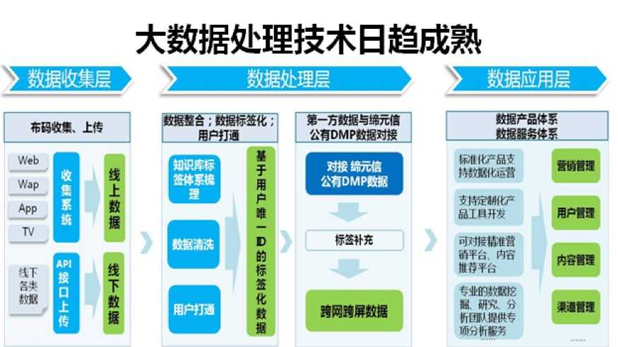 从收集到数据的清洗、加工、处理,这个环节把数据转化成信息的环节,然后再到上层的数据应用,这个环节是把信息转化成策略的环节,再对接就是业务。这个技术和方法不断成熟所带来的是企业如果想把自己的数据用起来的话,变成在技术上的可能。