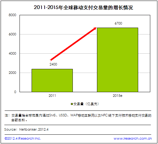 iResearch艾瑞咨询整理Netbanker的最新数据发现,2011年全球移动支付交易量达到2400亿美元。该统计数据显示,2015年全球移动支付交易量将达到6700亿美元,使用手机银行应用程序的用户数量较2010年将增加45%左右。另外,预计在未来18个月内还会有20个国家增设NFC服务。