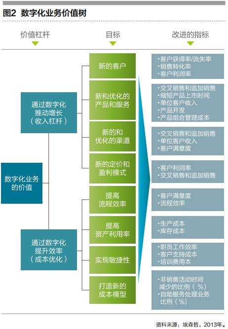 照此定义,成为数字化企业的过程,就是探寻“数字技术如何推动增长、创造一系列广泛的价值机遇”的过程,企业决策者应当建立这样的数字化业务价值树来审视转型的目标和进展(见图2)。