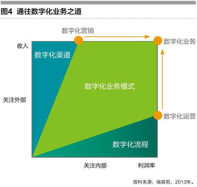 在数字化世界中,企业的增长前景将取决于两大因素:一、管理者为什么要采纳数字技术的初衷。二、数字技术如何改变了企业的商业模式。增长要求企业成为创新型数字化企业,而这与过去企业利用新技术取代旧技术而不改变运营模式的做法完全不同。当业务流程实现简单的数字化时,企业也仅仅是学会了应用技术,根本没有改变其商业模式或增长潜力。例如,通过将新技术应用于现有流程激发销售活力,或许能提高效率,但却不一定能改变企业的增长前景。还有,配置客户移动应用可以增加交易量,却不会增加企业收益,这也反映出数字化战略推行不够深入。这种情况中,客户的行为习惯并未发生变化,只是采用了新渠道而已,因为企业并未给他们提供拓展客户关系的动力。
