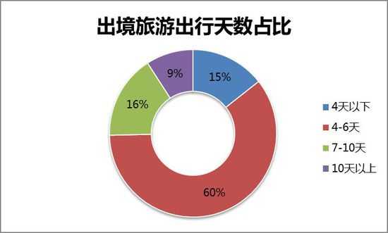出境游时长方面, 4-6天的出行天数最受用户欢迎,出游人次占比为60%,7-10天的人次占比为16%,10天以上占到15%,4天以下以当地游产品为多,出游人次占比为9%。