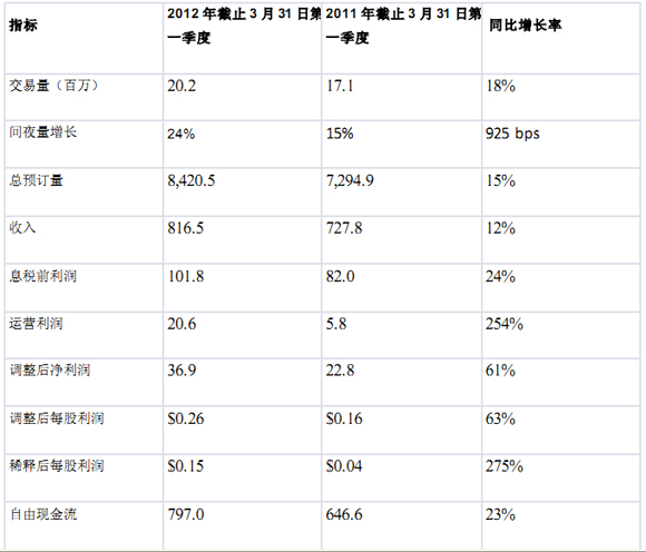 2012年4月26日,Expedia公布了其截止3月31日的第一季度财务业绩。收入同比增长了12%, 总预订量同比增长了15%。