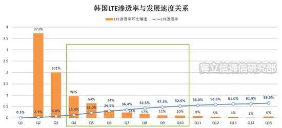韩国LTE渗透率在前三季度保持三位数的增长,在其后第四季度至第十季度保持七个季度的两位数增长,在第十一季度LTE渗透率的增速下降至个位数,保持缓慢发展。