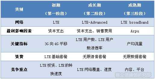 4G发展的成长期,竞争重点在于LTE网络覆盖、速度,运营商推出无限语音套餐,关键在于提升LTE用户数、LTE用户渗透率。
