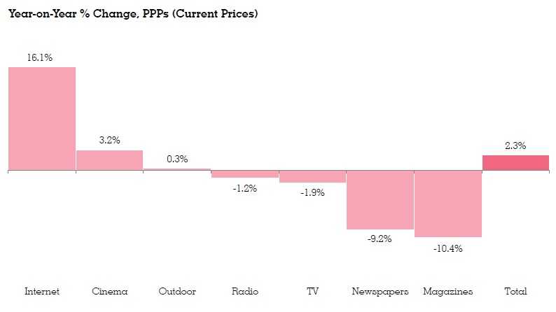 按照购买力计算(PPP),互联网(+16.1%),电影(3.2%)和户外广告(+0.3%)是预计2015年支出会有所增长的媒介。