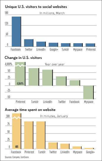 ComScore的一份调查结果显示,1月份每个用户花费在Facebook网站的时间为405分钟,花在Pinterest和Tumblr两个网站的平均时间都是89分钟。Twitter用户平均每月花费21分钟在该网站,LinkedIn用户平均每月花费时间为17分钟。不过,Google+用户在2012年1月份平均每人仅仅只花3分钟在此停留。