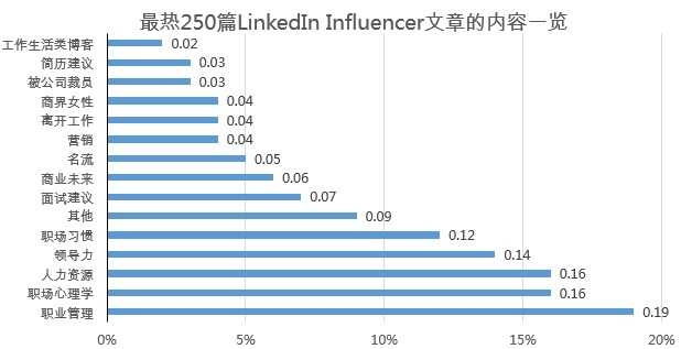 职业管理大类的文章是在LinkedIn Influencer最受欢迎的内容,没有之一,这必然和LinkedIn Influencer本身的定位有关。能给社交平台运营者的建议就是准确把握每个平台的特点,发布与平台最相关的内容,获得关注的可能性最高。一些最热职业管理类文章的例子,以“LinkedIn中国”微信公号标题为例:“职场上,双手抱胸你就输了”,“为什么你宁愿每周工作90小时,也不做任何改变?”。职场心理学常常包含以下主题:发展同理心、冲突的化解、个人生产力、个人幸福感。仅《真正受过教育的人,应该有这样的思维方式》一文,就获得了160万阅读,1.5万转发。另一篇《他改了密码,姑娘说了“Yes I do”》,收获了155万阅读。