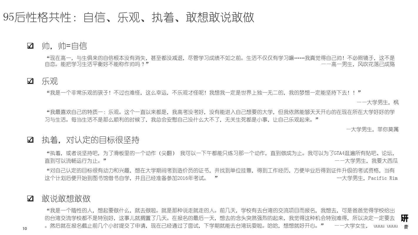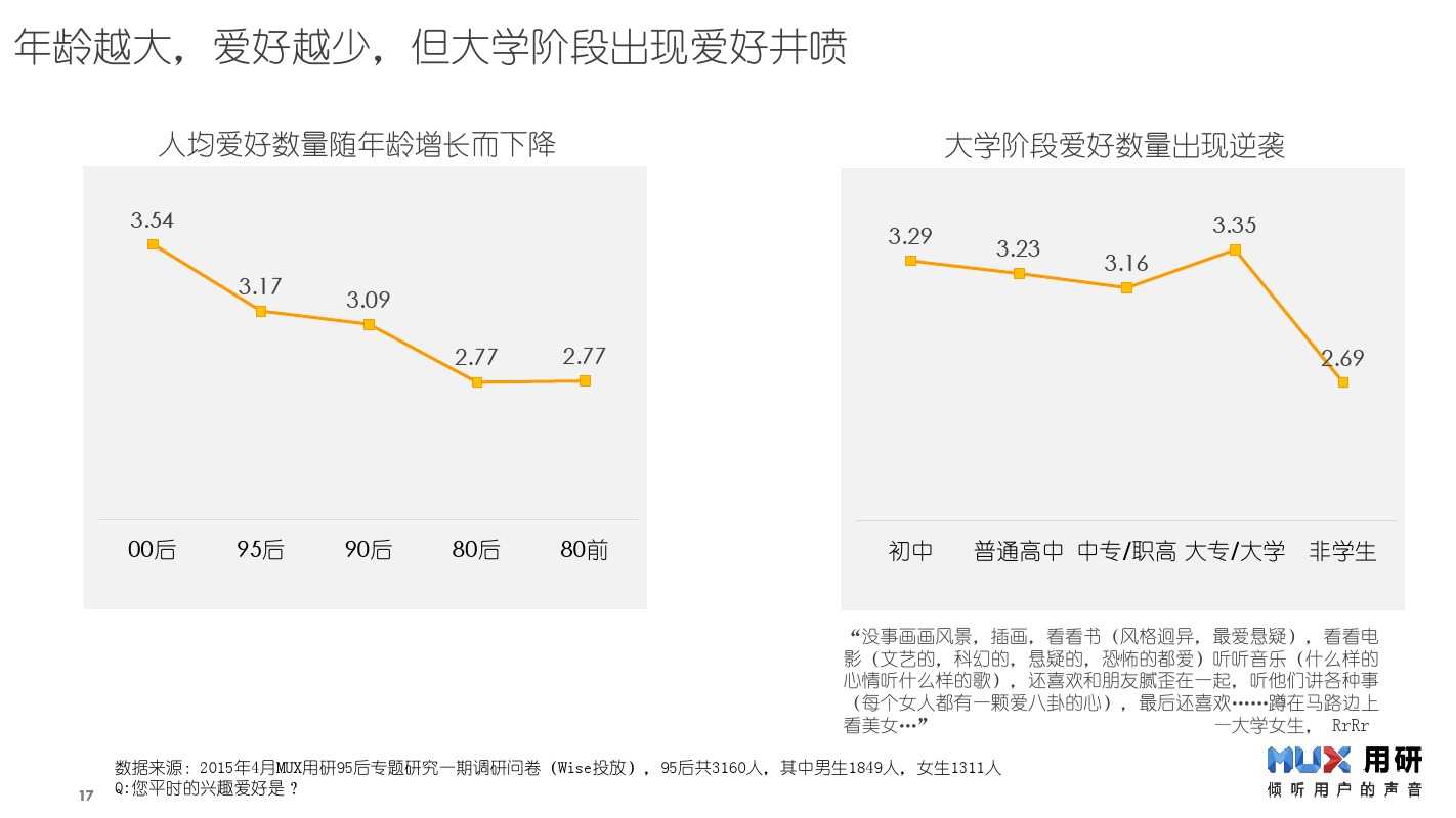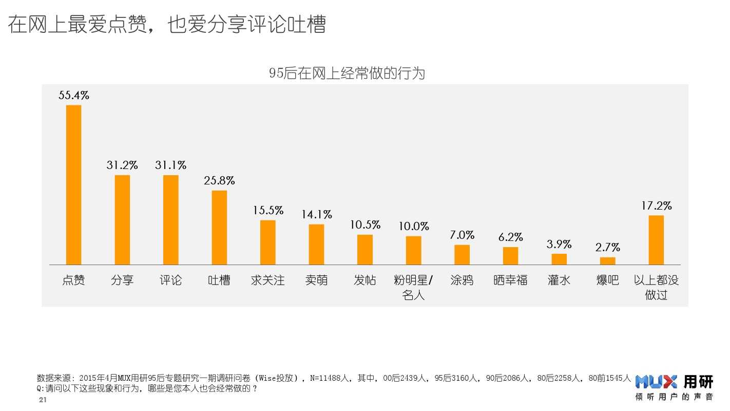 95后生活形态调研报告 via:百度移动用户体验部 更多阅读:阿里内部资料:95后的消费与社交【163页PPT】五张图告诉你美国95后上网都在做啥?成都农商银行:2017农村电子化调研报告NewsWhip:2019年95后内容消费趋势报告QQ大数据:揭示95后审美喜好决胜95后:品牌如何搞定这一代年轻人大街网:95后求职意愿调研赛诺: “95后”手机输入习惯研究分析报告泛娱乐社交一代:95后社交行为洞察报告95后手机使用调查报告Epsilon:2013年中国消费者忠诚度调研报告腾讯MXD:2013年手机刷机用户市场调研报告95后关注自动化汽车 未来成为潜在消费者95后大学生都在玩什么游戏?–信息图极光大数据:95后的freestyle,看重诚信,择偶不将就