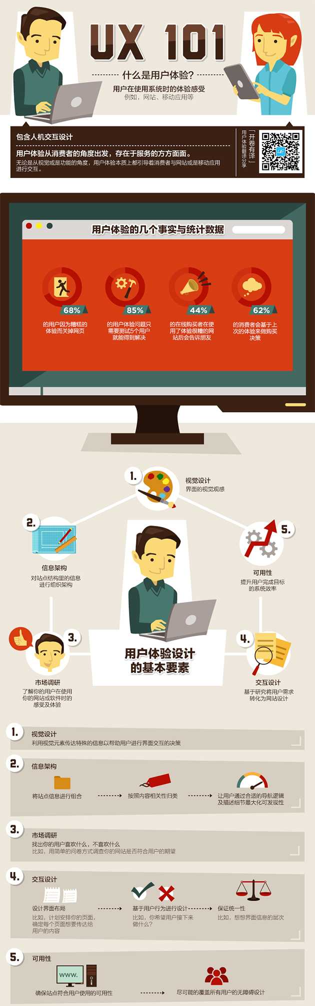 一张图科普什么是用户体验!–信息图 更多阅读:什么是用户体验?–信息图用户体验的那些事儿–信息图Adobe:从内容管理到用户体验管理信息图:网速就是一切kissmetrics:用户离开网站的8个原因移动应用设计用户体验:暗黑模式讲解2015年用户体验行业调查报告深入了解用户体验——情感化设计关于用户体验的三个反思以用户体验为中心的产品设计–25页PPT15个最佳的用户体验和用户界面工具和资源皮克斯教给我们的22条改善用户体验的原则IXDC:2015年用户体验行业调查报告产品思维将在用户体验设计中起重大作用图解:2015年用户体验行业调查报告