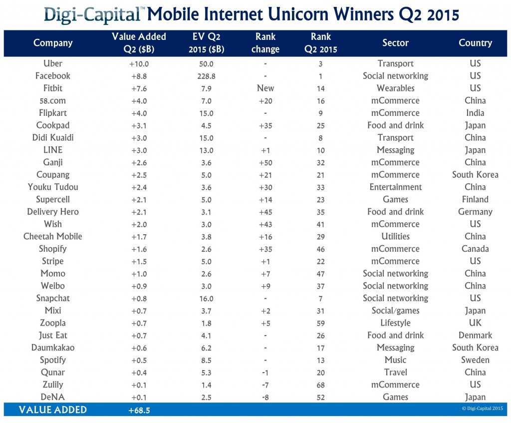 移动独角兽和投资者将成为超高赌注游戏的大赢家,第二季度28家企业估值增长685亿美元。最大的赢家包括Uber, Facebook 和 Fitbit,还有一些鲜为人知的企业,如58.com, Cookpad 和 Ganji。社交网络、移动电子商务和运输是增长最多的部类,美国和中国是估值增长最多的国家。