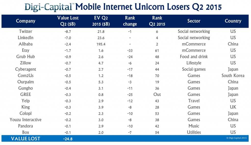 但是,并不是每个独角兽都是这场豪赌的赢家,第二季度,17家独角兽企业损失248亿美元,尤其是游戏类和美国企业,GREE甚至失去了独角兽的头衔。