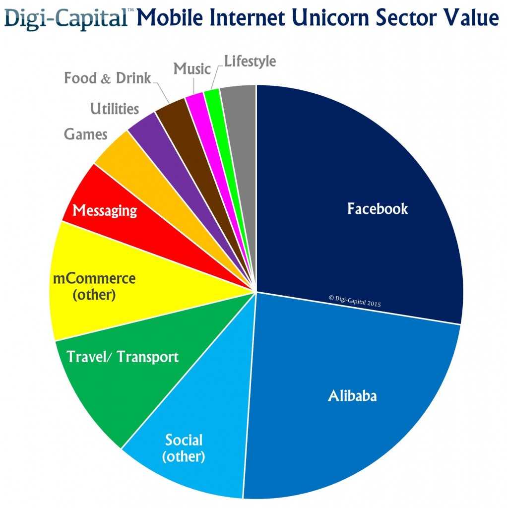 不是所有的独角兽创造的价值都相等,四个部类和两个国家在这方面领先。怪兽独角兽Facebook 和 Alibaba分属两个最大的部类,社交网络和移动电子商务分别占移动独角兽总价值的1/3。另两个部类是旅游/运输(包括Uber)和消息(包括WhatsApp 和 LINE)。