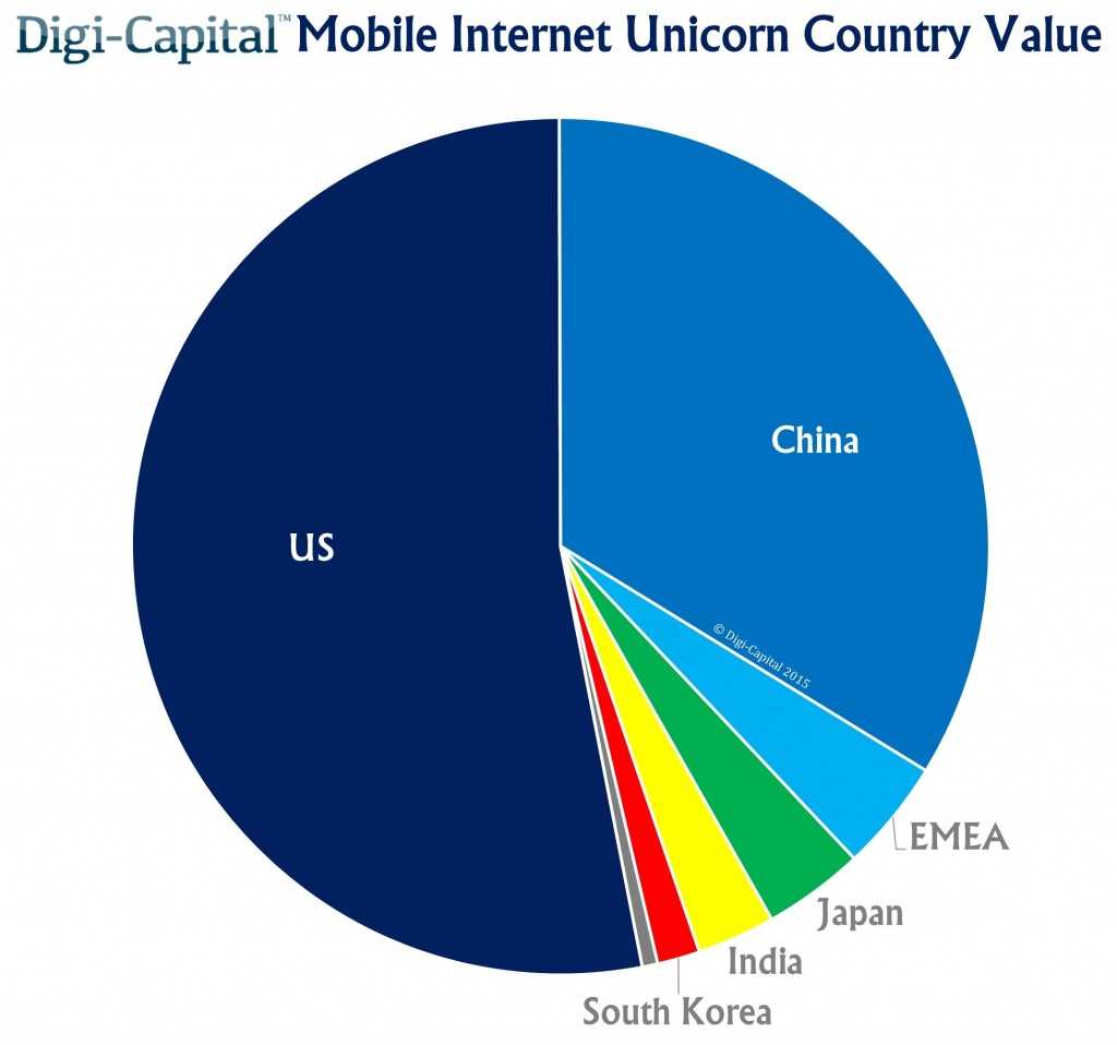 美国移动独角兽占移动独角兽总价值超过一半,中国移动独角兽占1/3。但是除去两家怪兽独角兽Facebook 和 Alibaba,美国占一半,中国下降至1/5。