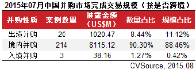 表4 2015年07月中国并购市场完成交易规模(按是否跨境)