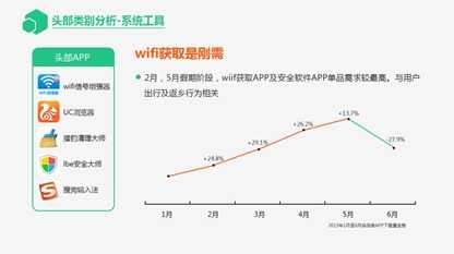 通过PP助手安卓版的监测,在2月和5月的假期阶段,用户对于wifi获取类APP和安全软件类APP单品需求较高。这说明在移动互联网时代,用户对于Wifi网络的获取仍旧是刚需,同时对于手机信息安全需求也较高,而这类APP的下载量激增也与用户出行及返乡行为相关。