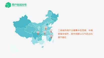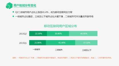 首先,在用户性别方面,2015年第二季度移动端女性用户占比上涨了2.6%,占比持续攀升,“女性经济”模式蓄势待发,将直接影响应用市场产品属性倾向女性需求及习惯,自拍、购物、美容、分享类应用将继续大行其道。而从用户地域分布变化方面来看,相较第一季度,第二季度二线城市用户占比上涨至41.4%,成为了移动互联网主力军。在二线城市中,用户主要集中在西南,中南部省会城市,其中成都以22%的占比居于首位。与此同时,移动互联网用户在一线城市占比持续稳定,三线及以下城市占比大则幅下滑,由此可见,二线城市可作为移动应用的重点开辟市场。