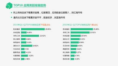通过PP助手安卓版对2015年Q1-Q2 TOP 10类别应用个数占比和下载量占比的监测数据发现,2015年上半年度,影音播放、系统工具和休闲益智三个类别的应用依旧占据了PP助手安卓版应用数量和用户下载量的TOP 3。而在TOP 10类别的应用中,网上购物品类下载的需求量高,位居第四,应用数量位居第八,属红海市场;通讯社交品类下载需求量平平,数量较多,属蓝海市场,相信这也将对广大应用开发者带来了全新的启示。