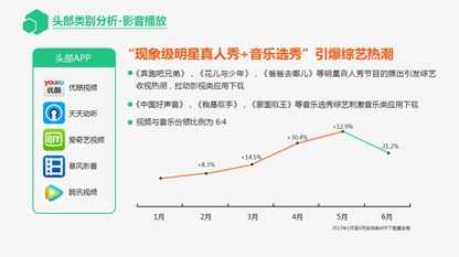从2015年第一季度开始,明星真人秀类节目和音乐选秀类节目不但引爆了电视银屏,同样也攻占了用户的手机。其中《奔跑吧兄弟》、《花儿与少年》、《爸爸去哪儿》等明星真人秀节目的播出引发了综艺收视热潮,拉动了优酷、爱奇艺等影视类应用下载;而《中国好声音》、《我是歌手》、《蒙面歌王》等音乐选秀则刺激了天天动听等音乐类应用下载。