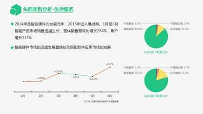 另外,2014年是智能硬件的发展元年,2015年进入了爆发期。上半年度,可穿戴设备、智能家居等智能硬件产品市场销售迅猛生长,整体销售额同比增长264%,用户增长215%。而智能硬件市场的迅猛发展也直接拉动了匹配软件应用市场的发展,并催生出了用户场景化生存、“软硬兼施”的全新生活方式。