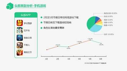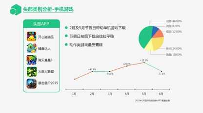 另外,节假日也对手机游戏的下载量有着较大的影响。通过PP助手安卓版的监测,2月及5月的节假日对单机游戏和网络游戏都有着较大的下载量带动作用,但不同的是单机游戏节假日前后下载曲线较平稳,而网络游戏节假日前后下载曲线较陡峭。而在游戏类型方面,动作类单机游戏和较色扮演了网络游戏最受用户的喜爱,下载量均超过了40%。