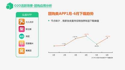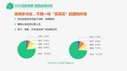 在O2O的活跃场景中,团购类应用的场景更加多元化,不再是一味的“买买买”。其中,百度糯米、美团、大众点评等于综合类团购市场已趋于成熟,格局稳定。而折扣、旅行、电影、美食等精细分类应用份额则在2015年上半年度持续上涨,但仍有广阔的发展空间。