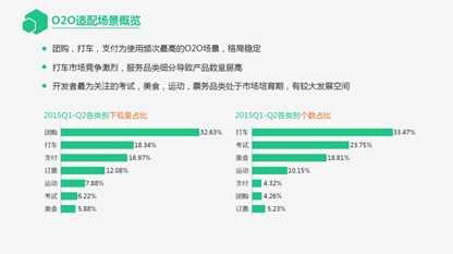 O2O支付方面,根据PP助手安卓版的监测,在2015年上半年,在线支付是支付品类最主流份额最大的应用类别,“出门不带钱”已经成为了O2O环境下的新型支付方式。同时,伴随O2O行业的发展,还衍生出了手机理财、手机信用卡支付、网赚等其他细分品类,但市场培育期较长。