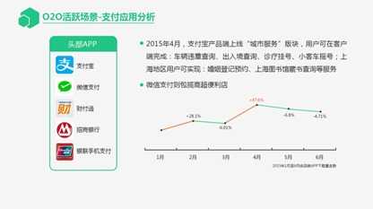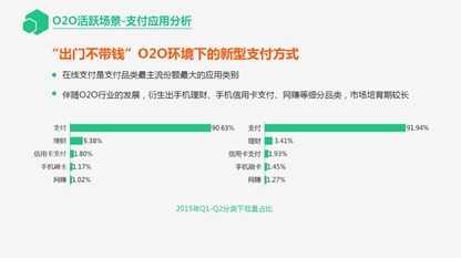 同时,O2O支付也已成为了互联网巨头的战场,2015年4月,支付宝产品端上线“城市服务”版块,用户可在客户端完成车辆违章查询、出入境查询、诊疗挂号、小客车摇号等服务,而微信支付则包揽了商超便利店的在线支付服务,由此可见,O2O支付将成为互联网巨头的下一个蛋糕。
