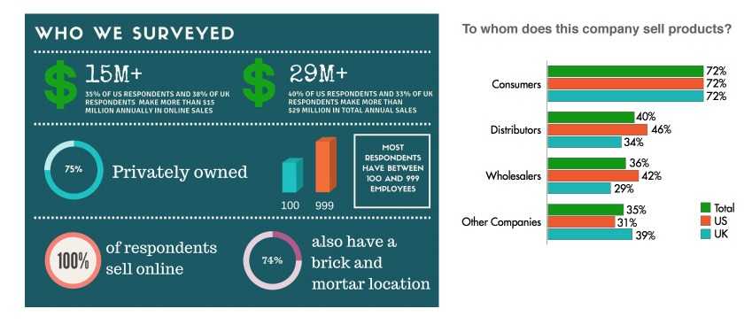 调查显示,37%受访者的全年网络销售额达1500万美元,40%超过2900万美元(79%的受访者也拥有实体店)。调查取得了重要的结果,也揭示了电商行业所存在的趋势、机遇和挑战。