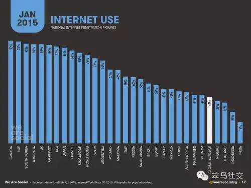 这份报告囊括了全球240个国家和地区(包括世界上30个最大经济体)有关互联网、移动以及社交媒体等方面的详细数据。