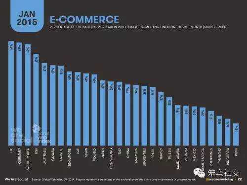 网上购物GlobalWebIndex公布的数据显示,英国在电子商务使用方面占据领先地位,该国2/3人口在过去一个月中通过网络购物。德国和韩国紧随其后,网上购物者各占该国人口总数的63%和62%,美国以56%位居第四。南亚和东南亚在这一领域落后很多,数据显示,在过去1个月中,仅有14%印度人网络购物;过去30天中,只有不到1/5的泰国人使用电子商务服务。