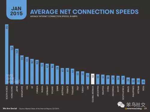 全球互联网连接速度也存在明显差异。韩国平均网速超过25Mbps,而印度网速仅2Mbps。中国香港、日本、新加坡以及美国是仅次于韩国之后网速最快的4个国家和地区,注册速度超过10Mbps,远远超过全球平均的4.5Mbps。