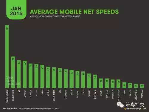 在固定网络接入方面,韩国只稍微领先于其他国家。但从移动网络速度上看,韩国移动运营商提供的平均网速可达18.2Mbps,几乎相当于其他国家的2倍。新加坡和英国紧随韩国之后,他们的平均网速分别为9.1Mbps和8.1Mbps。印度、巴西、阿根廷的移动网速都在2Mbps以下,而越南最慢,仅为1.1Mbps。
