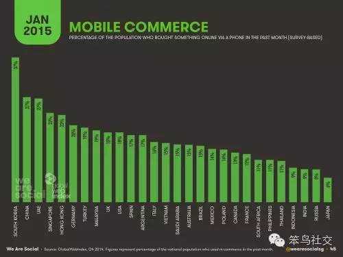 但移动电子商务在全球显示出猛增势头,特别是在东亚地区。数据显示,37%的韩国人过去一个月曾使用手机购物。中国手机购物活跃用户也在激增,过去30天中,有27%中国人使用手机购物。